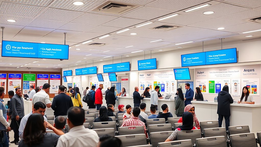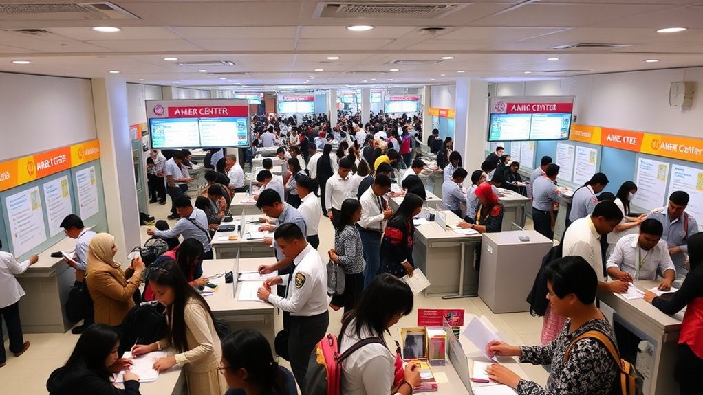 Amer Centers stand out by offering a streamlined approach to immigration services, making the visa application and renewal process more accessible for everyone. Functioning as one-stop shops, they simplify various visa and residency transactions, considerably reducing the need for multiple visits to different government offices. The trained staff provide clear guidance, guaranteeing you navigate through residency and visa issues smoothly. Comfortable seating and prominent signage enhance the overall experience, creating a customer-friendly environment. With direct assistance for visa applications and renewals, Amer Centers guarantee that all documentation meets government standards efficiently.