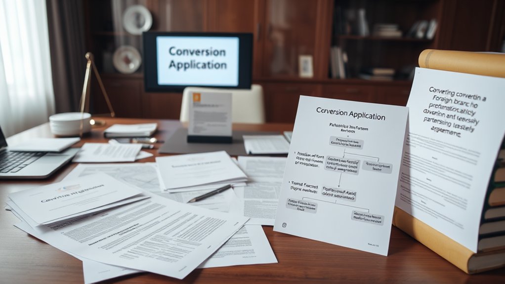 To successfully convert a foreign branch into an LLC, you'll need to gather several key documents. First, an amended Memorandum of Association (MOA) is essential, as it outlines the new company structure and operational objectives. You'll also require an updated trade license to guarantee compliance with local regulations. Share certificates must be issued to reflect the ownership interests of shareholders in the newly formed LLC. Additionally, all shareholders need to notarize the MOA and conversion documents to satisfy legal requirements. Finally, verify the availability of your desired name, confirming it includes the "LLC" suffix to adhere to local naming conventions. Collecting these documents meticulously will facilitate a smooth changeover into the LLC structure.