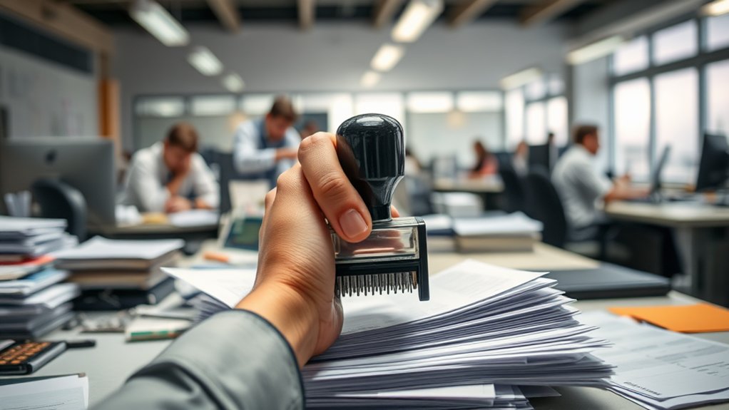 A distinctive stamp can greatly boost the security of your documents, making them harder to forge or duplicate. Custom stamps incorporate unique security features, such as specific designs and color schemes, which enhance document security and reinforce your brand identity. By aligning with regulatory standards, these stamps guarantee compliance and legitimacy in business transactions, safeguarding your company's reputation. Personalization, including the integration of your company logo, facilitates easy recognition and verification of official documents. Furthermore, custom stamps clearly indicate authorization from designated personnel, considerably reducing the risk of misunderstandings and disputes. Ultimately, investing in custom stamps not only fortifies forgery prevention but also elevates the professionalism of your documentation process.