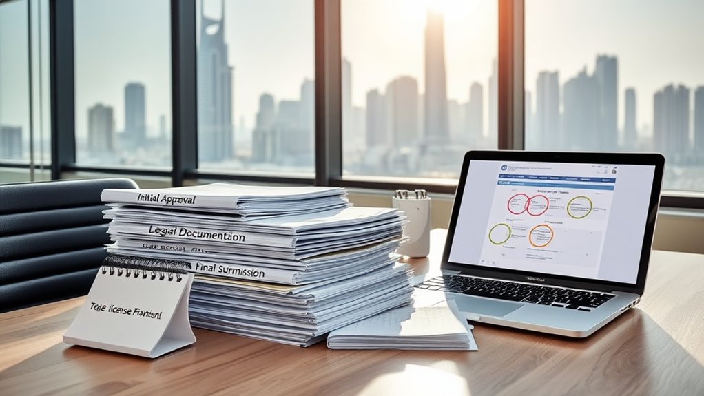 When applying for a trade license in Dubai, you'll need to gather several key documents to move forward with the final approval process. Adhering to the document submission requirements is essential for a smooth application process. Confirm your submissions are complete and accurate to avoid delays in the approval process. The necessary documents typically include: