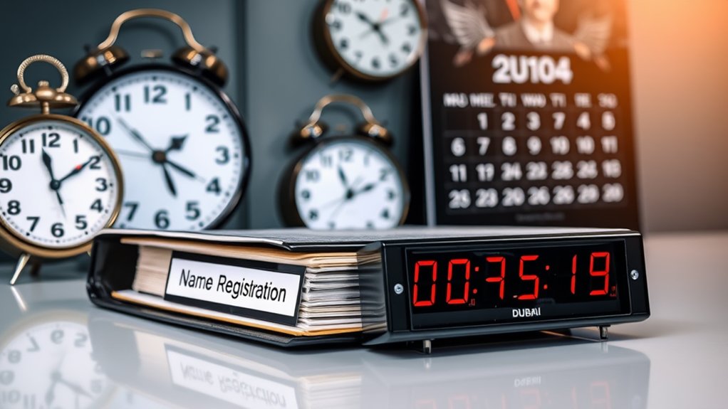 When you're ready to register your business name in Dubai, you're typically looking at a timeframe of 1 to 2 business days following initial approval from the Department of Economic Development (DED). To guarantee a smooth process, it's vital to choose a name that's unique and adheres to UAE naming conventions, as any similarity to existing businesses or the use of prohibited terms can lead to unexpected delays. By conducting thorough name searches beforehand, you can expedite this important step in the trade license application process.