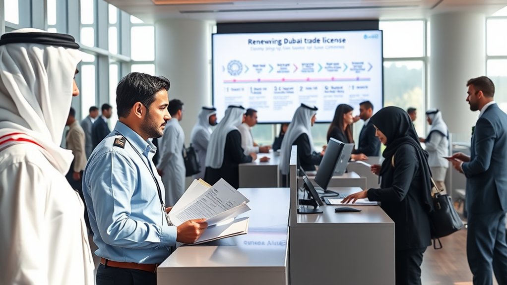 When you're ready to renew your trade license in Dubai, expect the process to take between 1 to 3 days, depending on your license type and specific requirements. To guarantee a seamless renewal process, consider these essential steps: