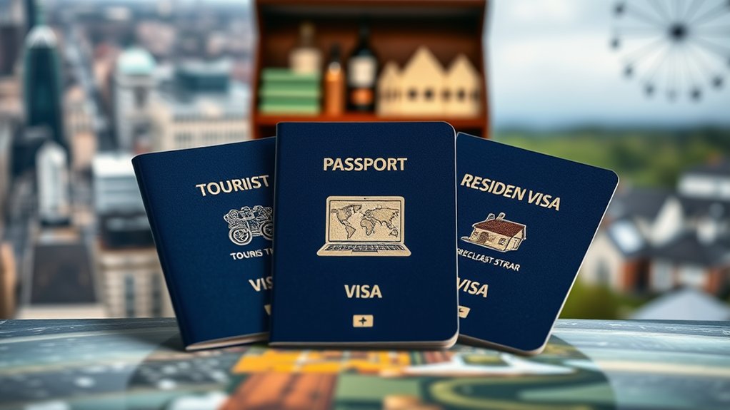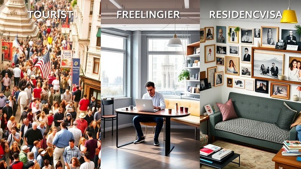 When comparing tourist, freelancer, and residence visas, each serves distinct purposes and durations. A tourist visa, typically valid for 30 to 90 days, permits leisure travel without work privileges. In contrast, a freelancer visa, ranging from 1 to 3 years, enables independent work with multiple clients, requiring proof of income and family sponsorship. Meanwhile, a residence visa offers long-term residency from 1 to 10 years, permitting work and access to essential services, also allowing family sponsorship. Understanding these differences helps you select the most suitable visa for your objectives, revealing various lifestyle and professional pathways you may explore ahead.